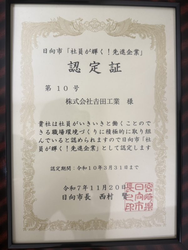 日向市「社員が輝く!先進企業」に認定されました 2025年11月28日